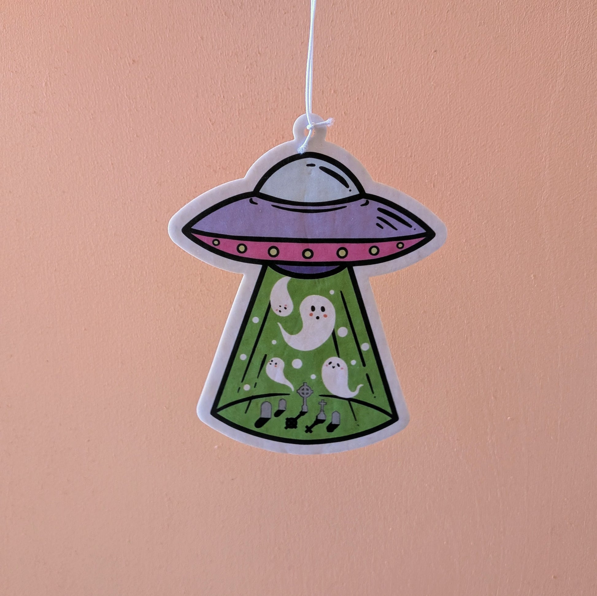 Beamed straight from the crypt, these little ghosts are hitching a ride to the afterlife—or maybe just the next galaxy over. Our air fresheners are reusable. Once the scent fades, spray with your favorite scents!